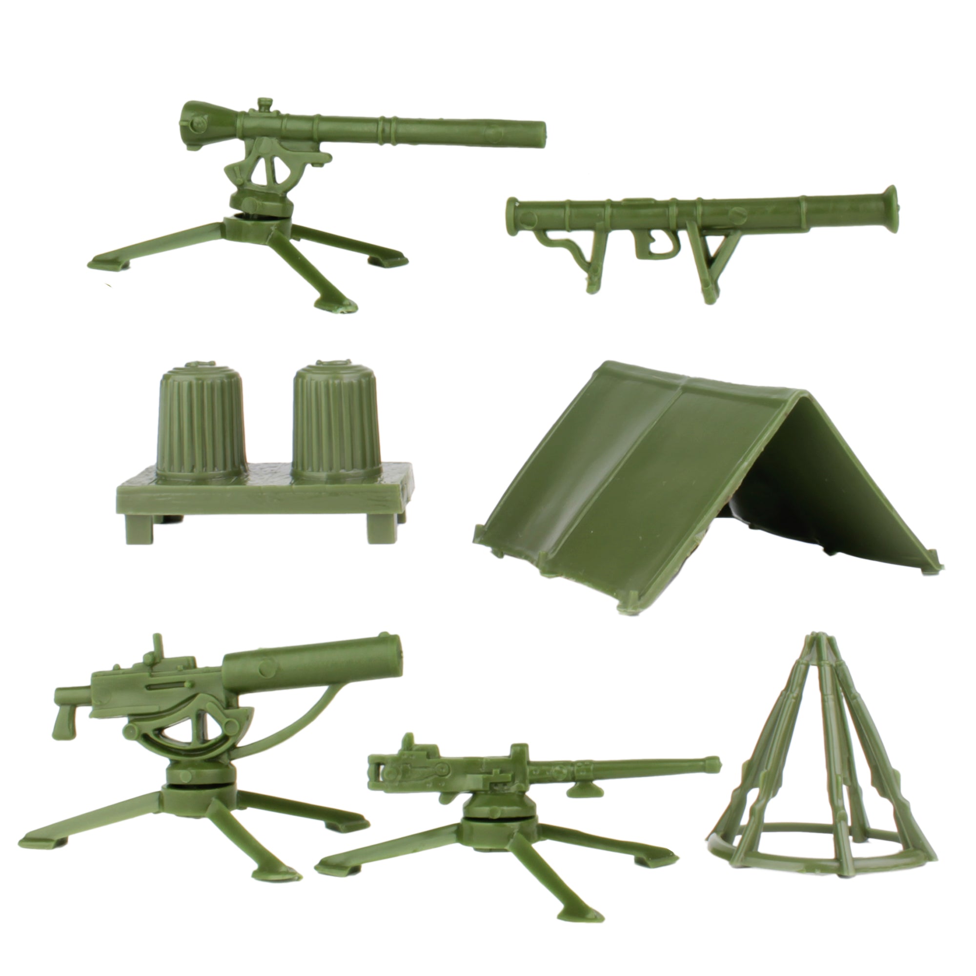 The accessories include 3 Pup Tents, 2 Rifle Stacks rifle stacks with five M1 Garands each, Trash Cans on Platform, M9A1 Bazooka, and tripod mounted M2 Browning50 Caliber Air-cooled MG, M1917 Browning Water-cooled MG, and M18 Recoilless Rifle. Scales of the vehicles and accessories vary from 1:72 to 1:24.