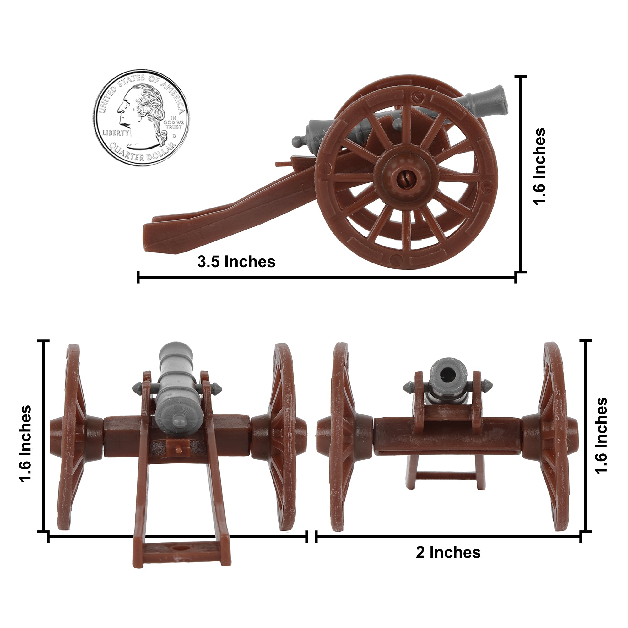 From the BMC Toys American Hero Collector Series, the American Revolutionary War Cannon and Mortar Set includes 3 cannon and 3 mortar with charcoal-gray barrels and brown chassis. Cannon feature rolling wheels and measure 3.5 inches long x 2 inches wide x1.6 inches tall. Mortar measure 3.1 inches long x 1.6 inches wide x 1.75 inches tall. Made from slightly stiff HDPE plastic with medium detail.