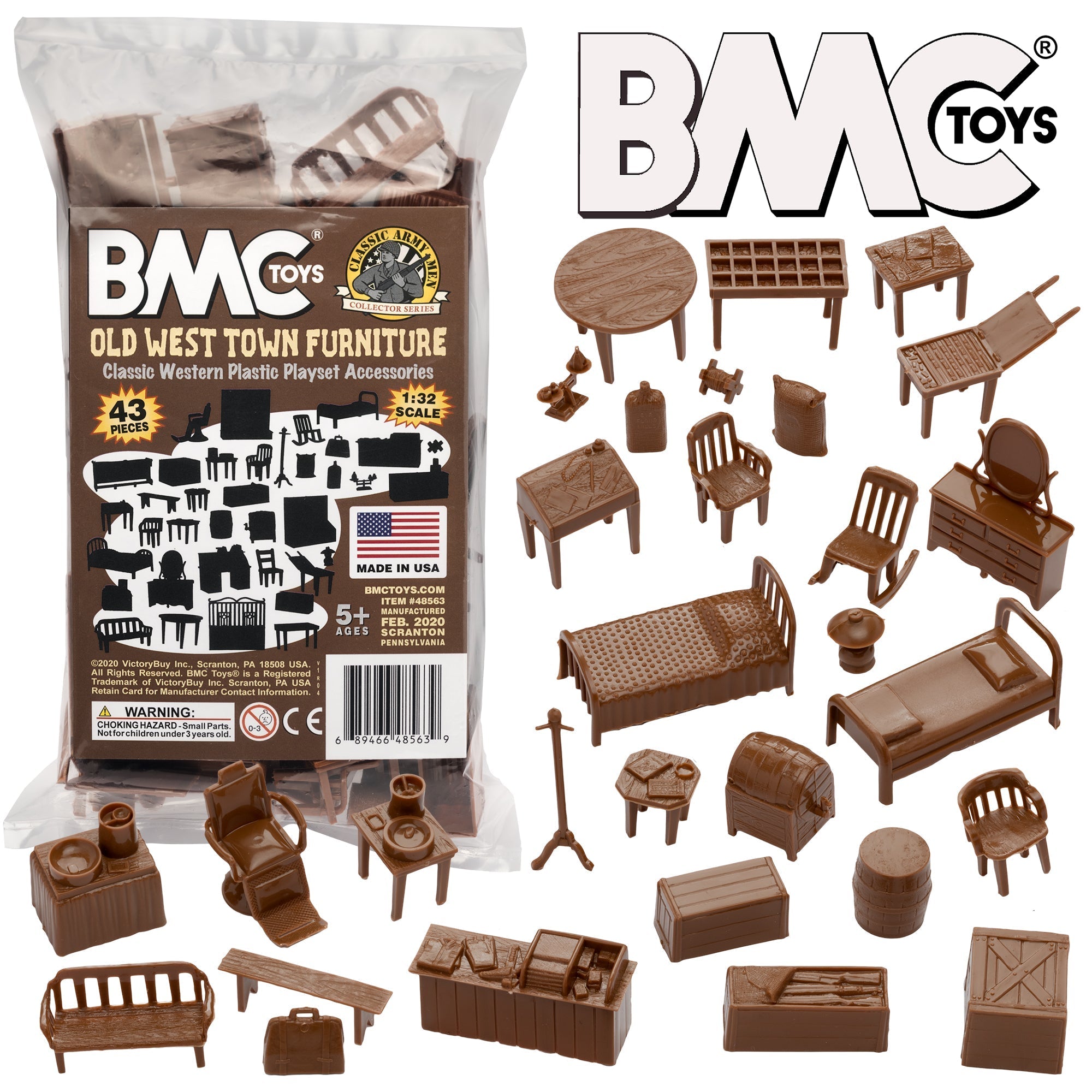From the Classic Army Men Collector Series, BMC Toys brings back more classic Playset accessories from yesteryear. This 42 piece Set includes a variety of old-timey furniture and accessories. Pieces are made from slightly stiff brown color HDPE plastic. Pieces include desks, chairs. benches, beds, bar, barrel, crates, rilfe crate, dresser, coat rack, barber chair, lantern, roll of Barbed Wire, general store counters and displays, sacks of feed and flour, printing press and wood block bench, brief case, and barrel with tap.