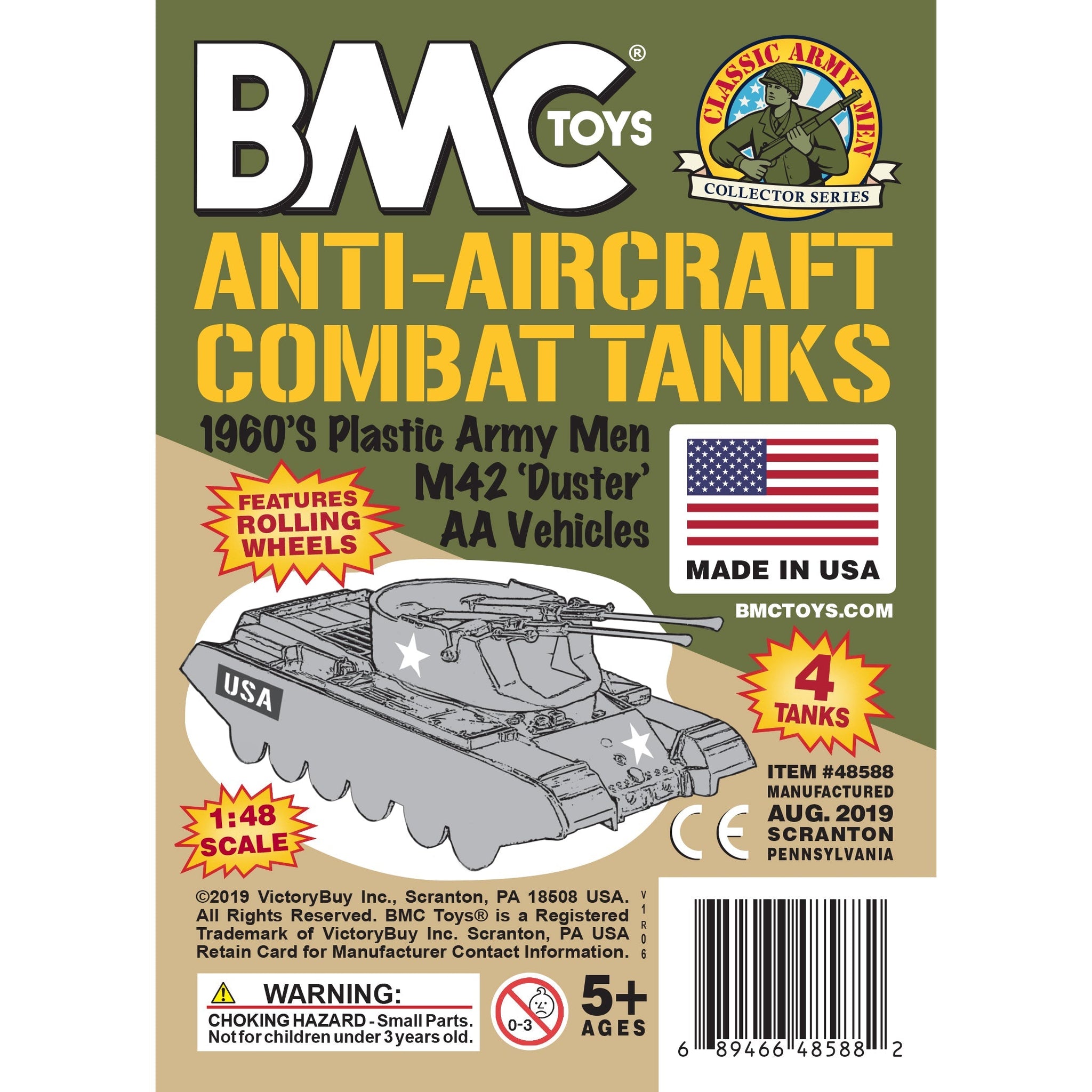 From the Classic Army Men Collector Series, BMC Toys brings back another American toy from yesteryear. This pack of 4 'Duster' Anti-Aircraft Tanks is proudly manufactured in the United States. The Set includes 2 tan and 2 olive-drab green vehicles and features barrells that pivot, turrets that rotate, and rolling wheels. Tanks are approximately 1:48 scale and are made from slightly flexible HDPE plastic with medium detail and very little flashing.
