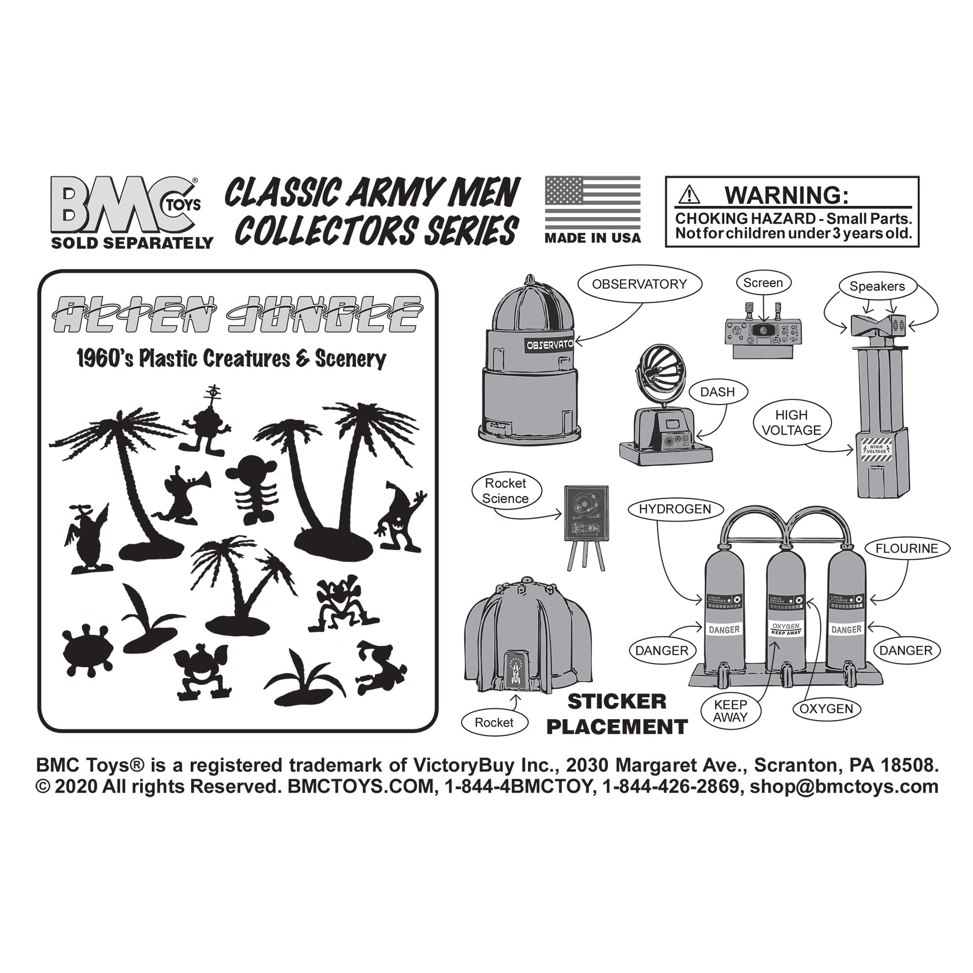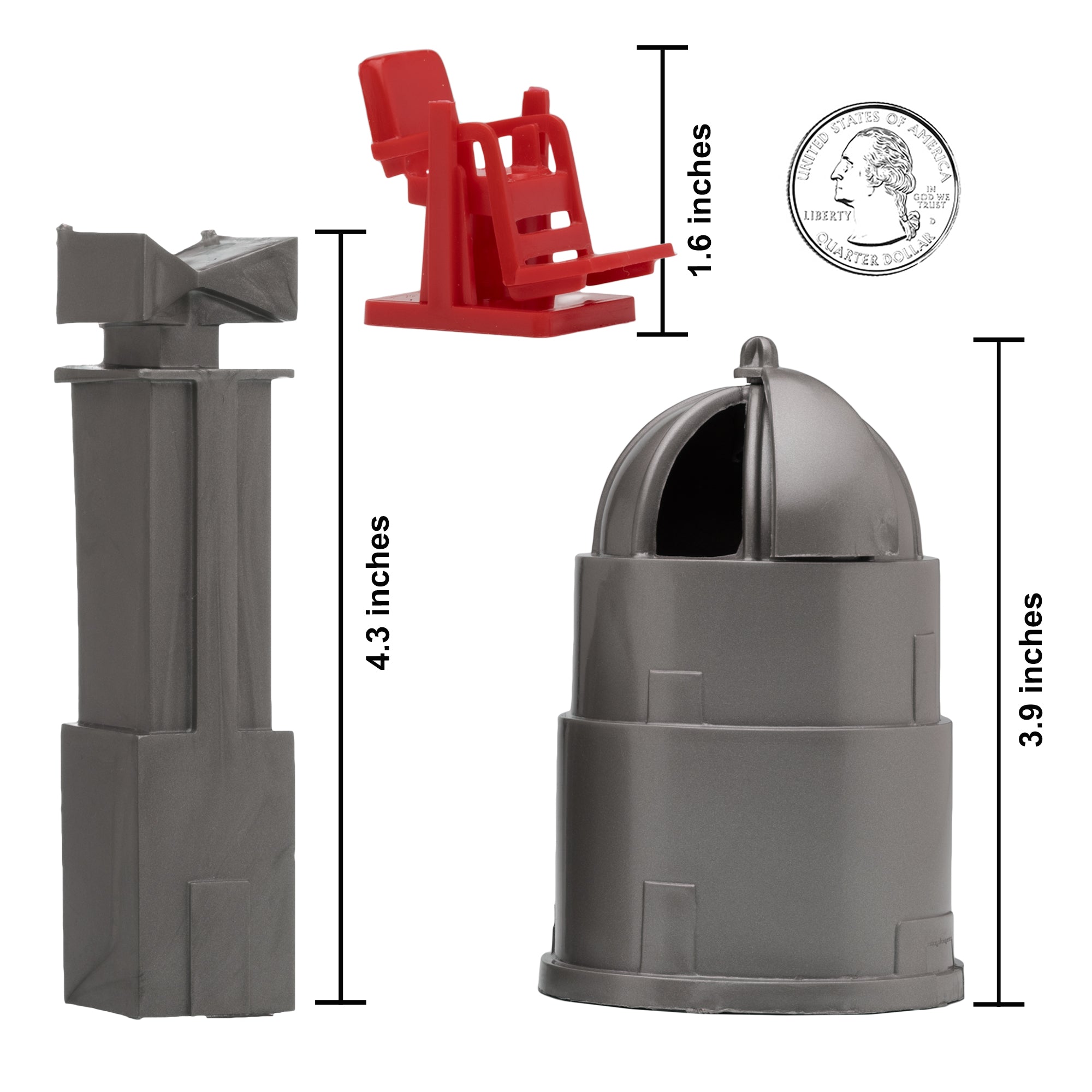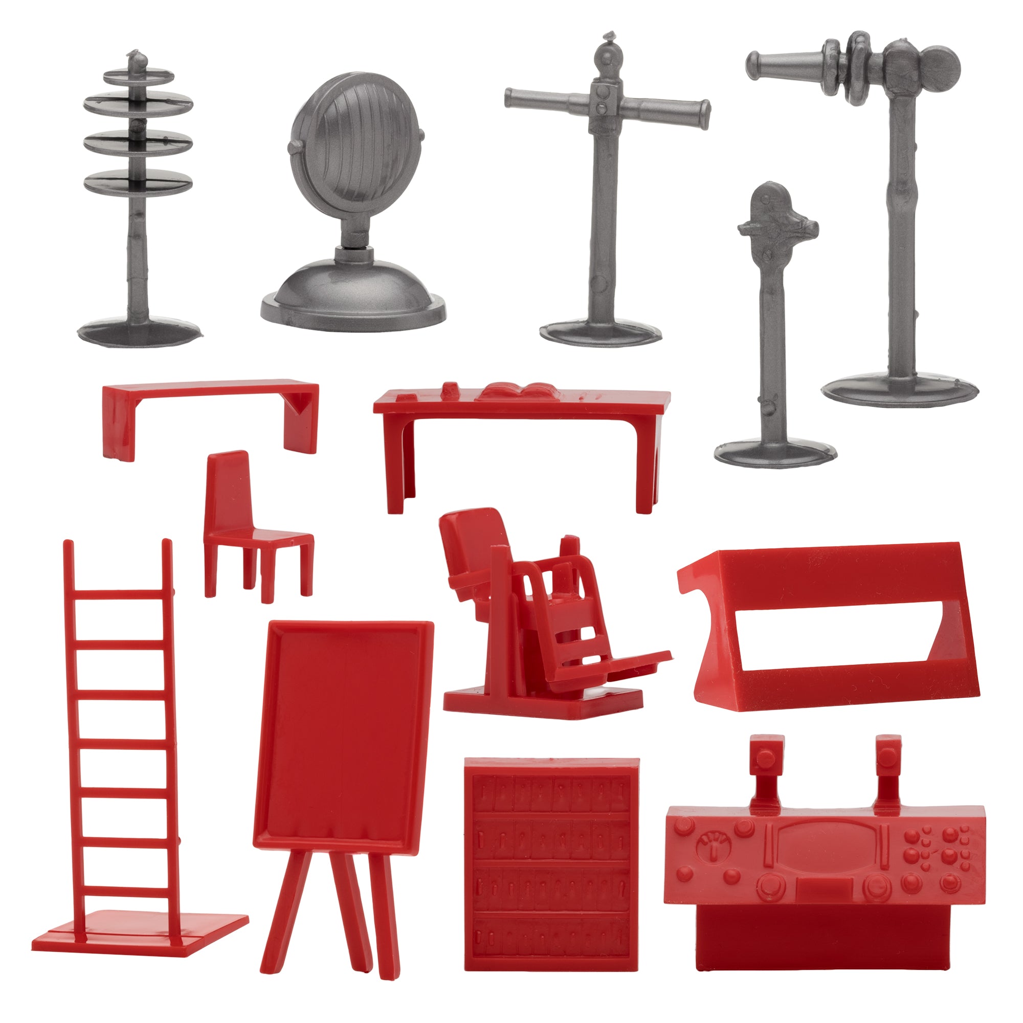 From the Classic Army Men Collector Series, BMC Toys brings back more classic toys from yesteryear. This 24 piece Set of includes a variety of space themed accessories and furniture. The following pieces are made from slightly stiff Stainless-Steel color HDPE plastic: Gravity Chamber, Observatory Dome with skylight, 3 chamber Fuel Tank, Radar Antenna, Supply Cabinet, Speaker Tower, Laser on Stand, Searchlight on base, Camera on stand, Telescope on stand, and Disc Antenna. These pieces are made from slightly stiff red HDPE plastic: Teacher Desk, Chair, Easel, Ladder, 2 Student Desks, 4 Student Benches, Control Chair, and Control Console. These accessories were first offered in the 1950s by Louis Marx and Co. and were included in a number of their legendary Playsets spanning many years including Tom Corbett Space Academy, Space Patrol, Rex Mars, Captain Space, Cape Canaveral, Operation Moonbase, Martian Landing and even the 1979 Galaxy Command Playset during the Star Wars craze. This new production is manufactured using the original plastic injection tools. This is a Set of real American Made plastic toys, meant to be set up, knocked over, picked up, and played with for many years to come. Packed in clear bag bag with insert card and recommended for ages 5 and up.