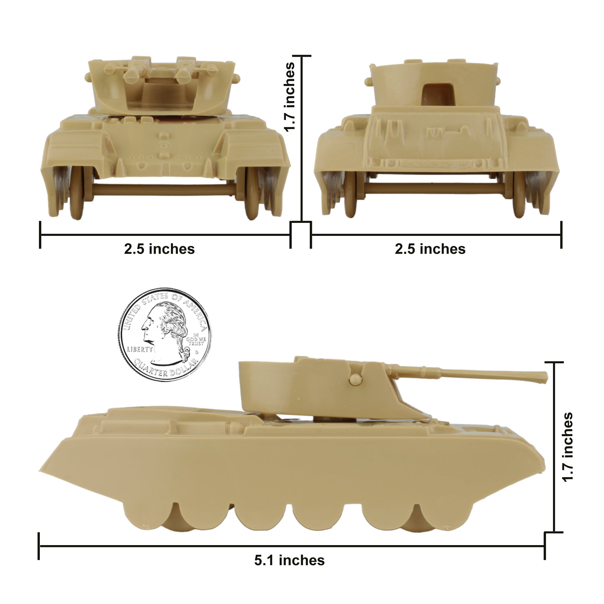 From the Classic Army Men Collector Series, BMC Toys brings back another American toy from yesteryear. This pack of 4 'Duster' Anti-Aircraft Tanks is proudly manufactured in the United States. The Set includes 4 tan vehicles and features barrells that pivot, turrets that rotate, and rolling wheels. Tanks are approximately 1:48 scale and are made from slightly flexible HDPE plastic with medium detail and very little flashing. These Tanks were originally produced in the 1960s by PAYTON and were included in numerous plastic military Playsets from several companies over the years. They were even copied and produced overseas in the 1980s. Even in the 21st century they're still great reinforcements for your Plastic Army Men forces, and also just the right size for O-gauge train flatbed cars. This is a Set of real American Made plastic toys, meant to be rolled around, knocked over, picked up and played with for many years to come. Packed in clear bag bag with insert card and recommended for ages 5 and up.