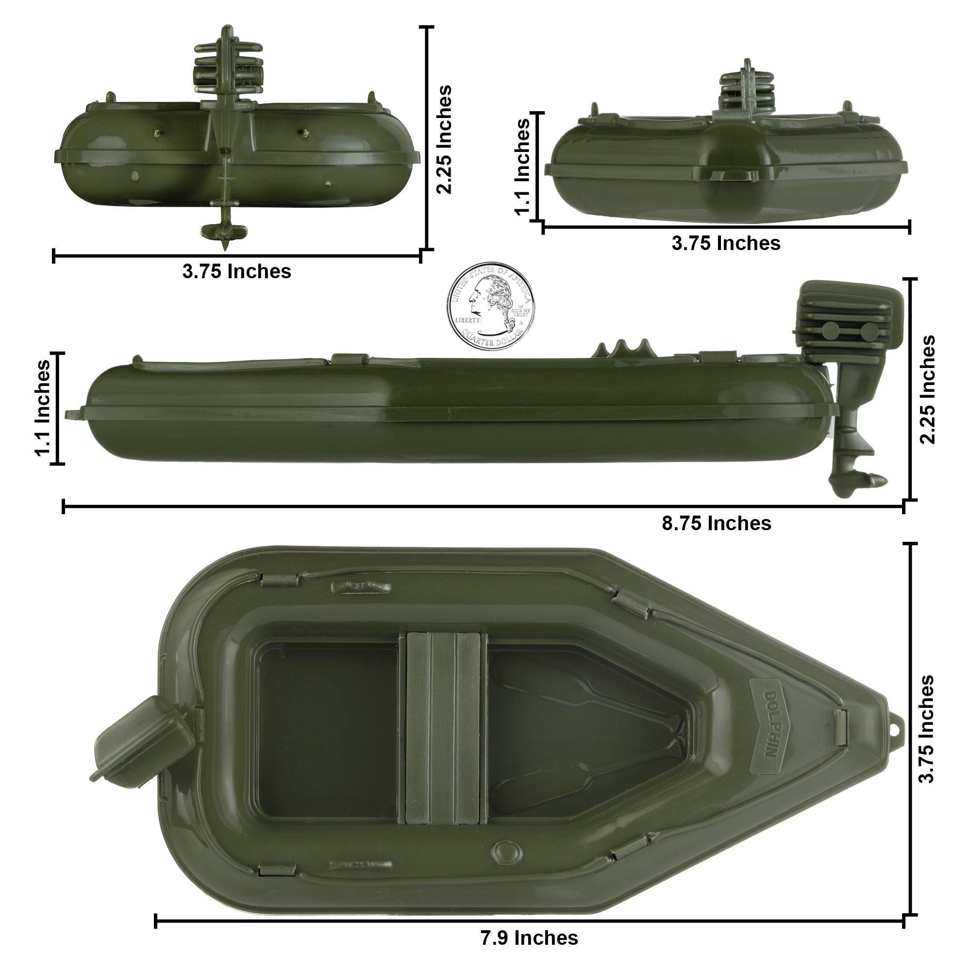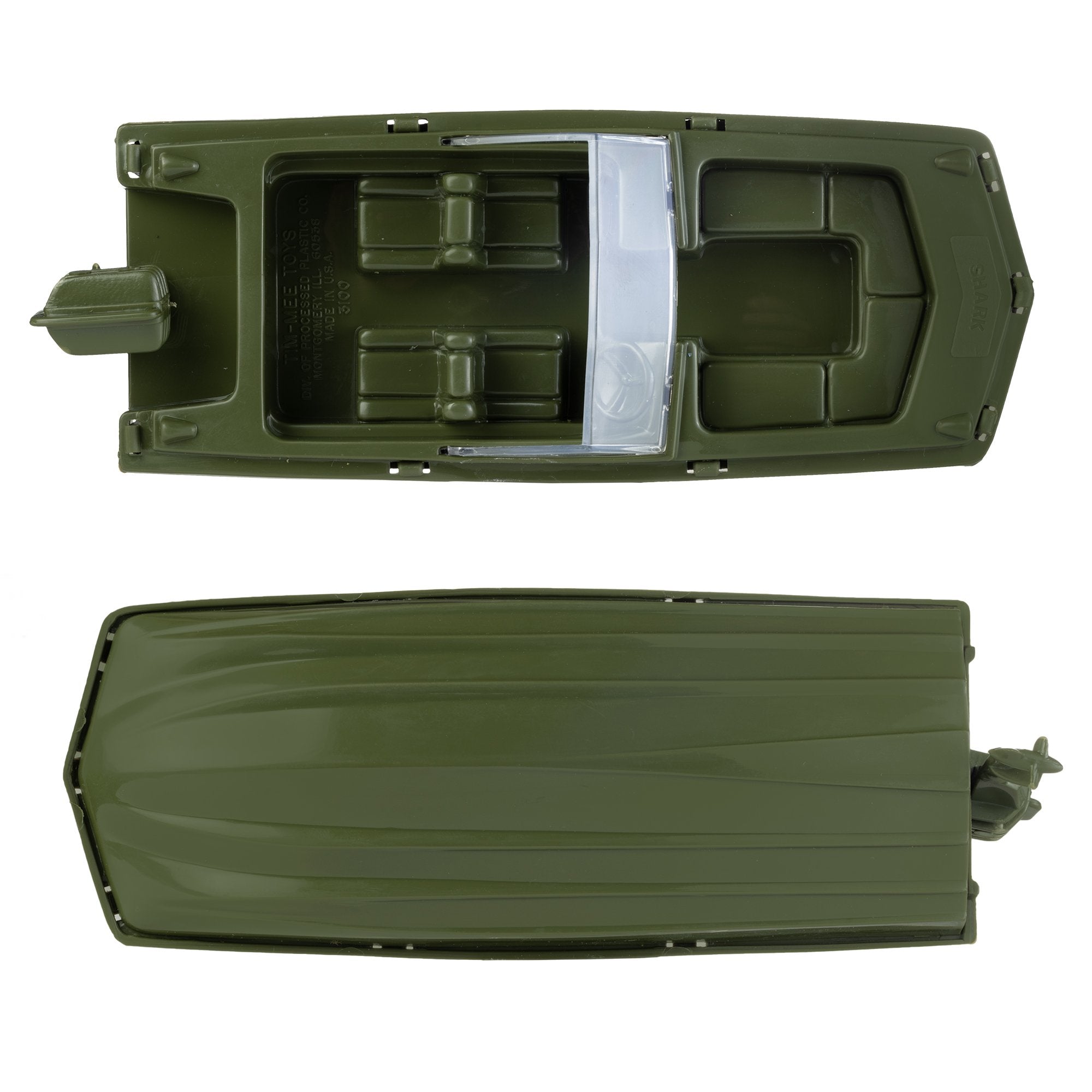 The Tim Mee Toy PATROL BOATS are ready for the waves. This #3100 three piece Set is proudly manufactured in the United States. They float in water, measures about 8 inches long, and are approximately 1:24 scale. Made from slightly stiff Olive-Green color HDPE plastic with very little flashing. This Set includes 3 different water craft, each with name plastic injection tooled on the bow. The DOLPHIN is modeled after a rubber boat with a nearly pointed bow and outboard motor. The BARRACUDA is hydrofoil racing boat with a hot-rod onboard motor. The SHARK resembles a Boston Whaler Skimmer with outboard motor and clear windshield. Processed Plastic Co. (Tim Mee Toy's parent company at the time) produced these boats for many decades starting around the 1960s. They were usually plastic injection tooled in red, white and blue and offered as bin toys. The Dolphin was sometimes included in a bagged Set along with Soldiers labeled 'Marine Beach Assault with Dinghy'. This Set includes a special water resistant polypro sticker sheet with the classic Tim Mee Toy stars and serial numbers. This is very likely the first time these boats have been offered as a Set in this color. These are real toys, meant to be played with in the pool or bathtub for many years to come. Recommended for ages 5 and up.