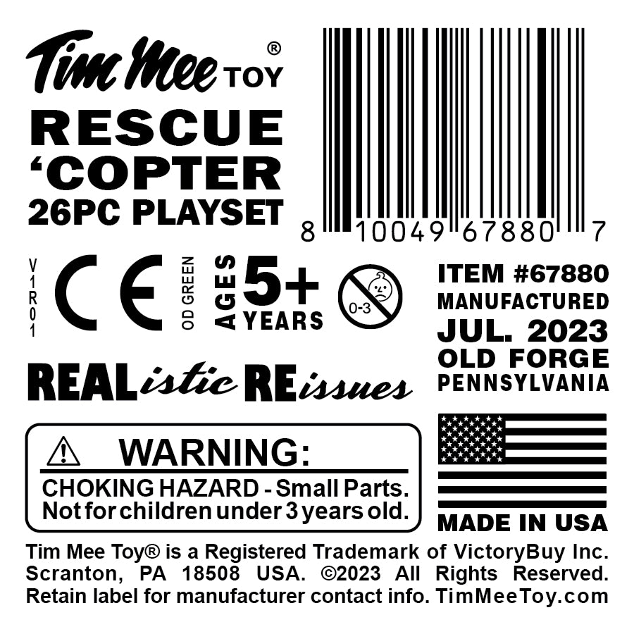 Air Extraction for your Plastic Army Men has arrived. The Tim Mee Toy Military Rescue 'Copter is once again proudly manufactured in the United States and available as this 26 piece Set. Set includes a Sea King Helicopter, American flag with base, and 2 dozen M16 Soldier figures. The chopper is modeled after the Sikorsky SH-3 and features spinning main rotor and stationary landing wheels. The fuselage measures 13 inches long, 3.25 inches tall and 3.75 inches wide. The aircraft is made from slightly stiff OD-Green color HDPE plastic and the Soldiers are made from slightly flexible LDPE plastic, both have very little flashing. The helicopter is approximately 1:48 scale and the figures are 1:35 scale.