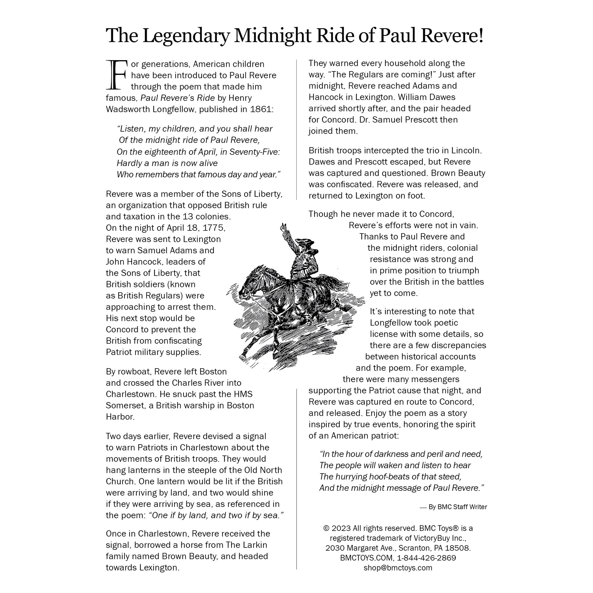 From the Classic Army Men Collector Series, BMC Toys brings the American Revolution to life. This 21 piece Set includes Paul Revere riding a horse, Samuel Adams, James Otis, 3 Colonial Civilians, 2 lanterns, and a variety of furniture and accessories. Figures stand up to 2.2 inches tall and are made from flexible LDPE Soft-White color plastic with very little flashing and lots of detail. The riding horse is made from Polypropylene Black color plastic with just a little flashing. Accessories are made from slightly stiff Rust-Brown color HDPE plastic. Pieces include chair. rocker, 3 stools, 2 benches, table, 2 lanterns, spinning wheel, musket stack, cast iron kettle, and horse hitching post. This Set includes what are often referred to as 'Colonial Characters' and 'Revolutionary War Accessory Group' They were first offered in the 1950s by Louis Marx and Co. and were included in a number of their legendary Playsets spanning many years including several Revolutionary War theme Sets. This new production is manufactured using the original plastic injection tools. Perfect for a historical diorama, as a stand alone miniature Set, or a welcome addition to any 1:32 scale American War for Independence Playset. This is a Set of real American Made toys, meant to be set up, knocked over, picked up, and played with for many years to come. An original story about the 'real' history of this famous 'The Midnight Ride of Paul Revere' is included on the back of the package insert. Packed in clear bag with insert card and recommended for ages 5 and up.
