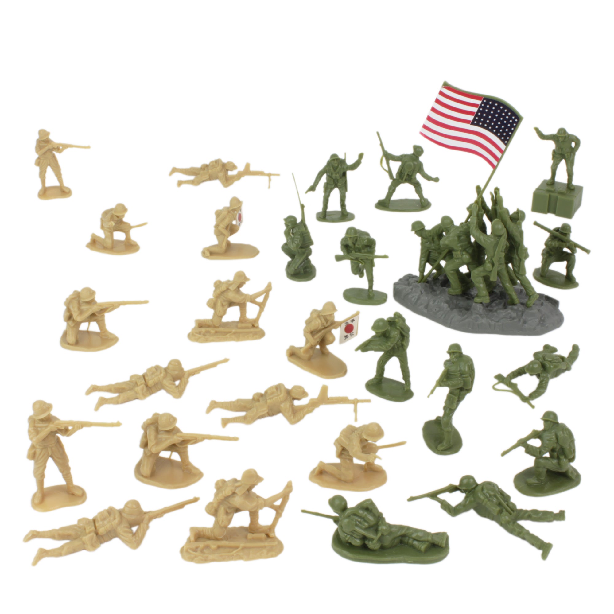 From the BMC Toys American Hero Collector Series, the most iconic moment from the Pacific War theater: The Battle of Iwo Jima 32 piece Plastic Army Men Set features 6 Marines raising the American flag on Mount Suribachi, plus 19 different figures including 12 United Stated Marines in OD-Green and 14 Japanese Soldiers in Tan.