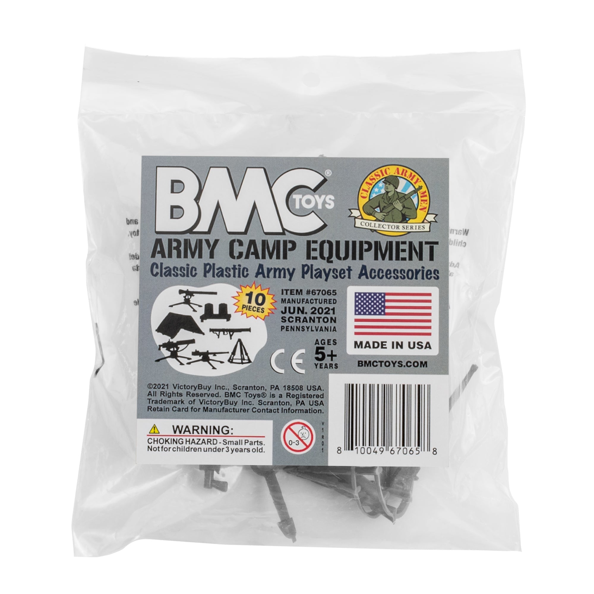 From the Classic Army Men Collector Series, BMC Toys brings back another American toy from yesteryear. This bag of 10 Gray Army CAMP EQUIPmenT is proudly manufactured in the United States. The Set features 10 pieces and includes 3 Pup Tents, 2 Rifle Stacks rifle stacks with five M1 Garands each, Trash Cans on Platform, M9A1 Bazooka, and tripod mounted M2 Browning50 Caliber Air-cooled MG, M1917 Browning Water-cooled MG, and M18 Recoilless Rifle. Pieces vary from approximately 1:24 scale to 1:30 scale and are made from slightly flexible HDPE plastic with medium detail and very little flashing. These pieces were originally produced in the 1950s by Louis Marx and Co. for the Army Training Center Playset and were included in numerous Marx Toys military Playsets spanning many years. They are often referred to as the Training Center Field Accessories and known as group PL-348. This is a Set of real American Made plastic toys, meant to be set up, knocked down, picked up and played with for many years to come. Little Green Army Men have even been inducted into the National Toy Hall of Fame. Packed in clear bag with header card and recommended for ages 5 and up.