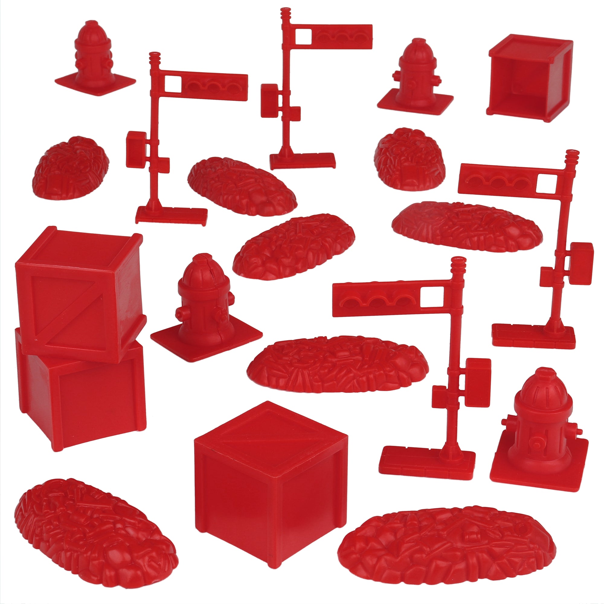 From the BMC Toys Classic Army Men Collector Series. This 20 piece Set includes accessories made from slightly stiff red color polypropylene plastic. Pieces include 4 each fire hydrants, Large crates, and traffic lights along with 8 trash piles. Traffic lights stand 3.5 inches tall and scales vary from approximately 1:18 to 1:48. The fire hydrants are approximately 1:18 scale (action figure size) while the traffic lights are approximately 1:48 scale which is closer to Army Men size. This Set includes parts that were originally imported from China by Processed Plastic Co. (Tim Mee Toy's parent company at the time) to be included in various Firemen Playsets. While best known for manufacturing toys in the United States, Processed Plastic Co. imported some parts in later years to keep costs down. Packed in clear bag bag with label and recommended for ages 5 and up.