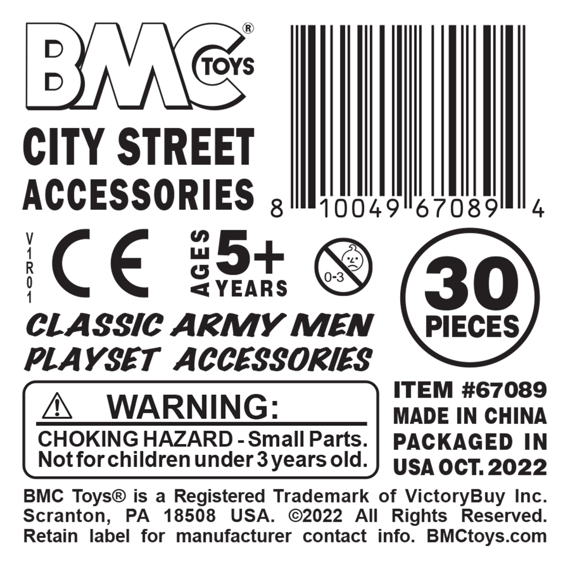 From the BMC Toys Classic Army Men Collector Series. This 30 piece Set includes accessories made from slightly stiff polypropylene plastic. Red color pieces include 2 each traffic lights, fire hydrants, Large crates and 4 trash piles. Gray color pieces includes 2 each gas pumps, crushed cars, logs and 4 rocks. Caramel tan color pieces include 2 each traffic lights, fence barriers, concrete barriers, and 4 small rocks. Traffic lights stand 3.5 inches tall and scales vary from approximately 1:18 to 1:48. This Set includes parts that were originally imported from China by Processed Plastic Co. (Tim Mee Toy's parent company) to be included in various Firemen, Construction, and 4x4 Monster Truck Playsets. While best known for manufacturing toys in the United States, Processed Plastic Co. imported some parts in later years to keep costs down. Packed in clear bag bag with label and recommended for ages 5 and up.
