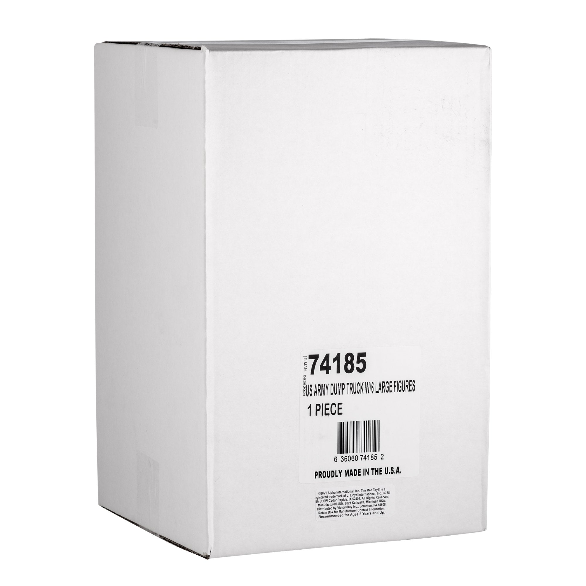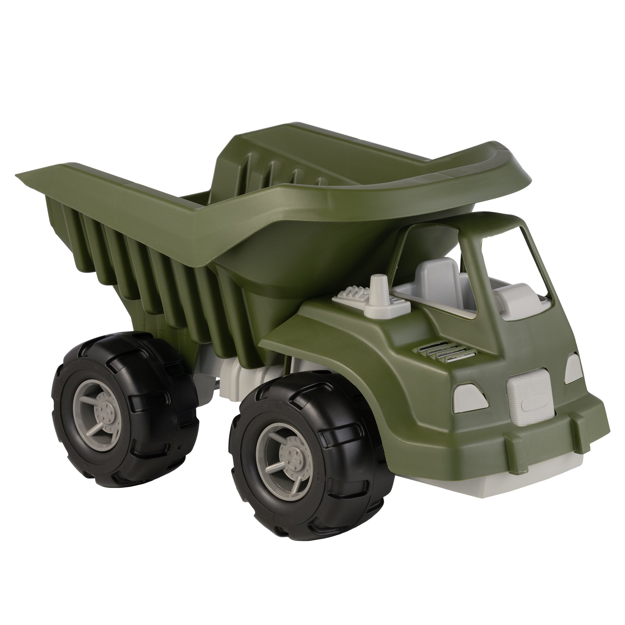 The Tim Mee Toy Heavy Haulers Dump Truck is a safe and durable construction vehicle for indoor and outdoor play and includes 6 jumbo classic Army Men figures. This Set is proudly manufactured in the United States and the truck features smooth rolling beefy wheels with 1/4 inch diameter thick metal axles. Made from slightly stiff HDPE plastic with smooth edges and reinforced in all the right places. Truck measures 15 inches long, 8.75 inches tall and 9 inches wide and the Dump Bed tilts all the way back for easy unloading of precious cargo like blocks or small stones. Soldiers and Truck are Olive-Green with Gray interior and chassis.