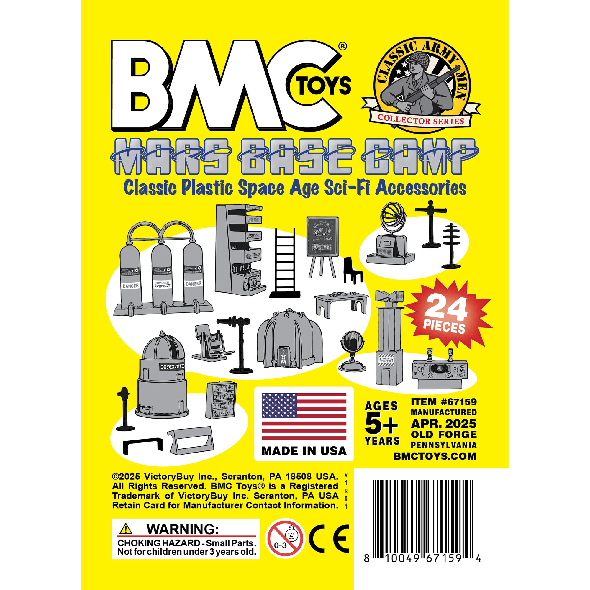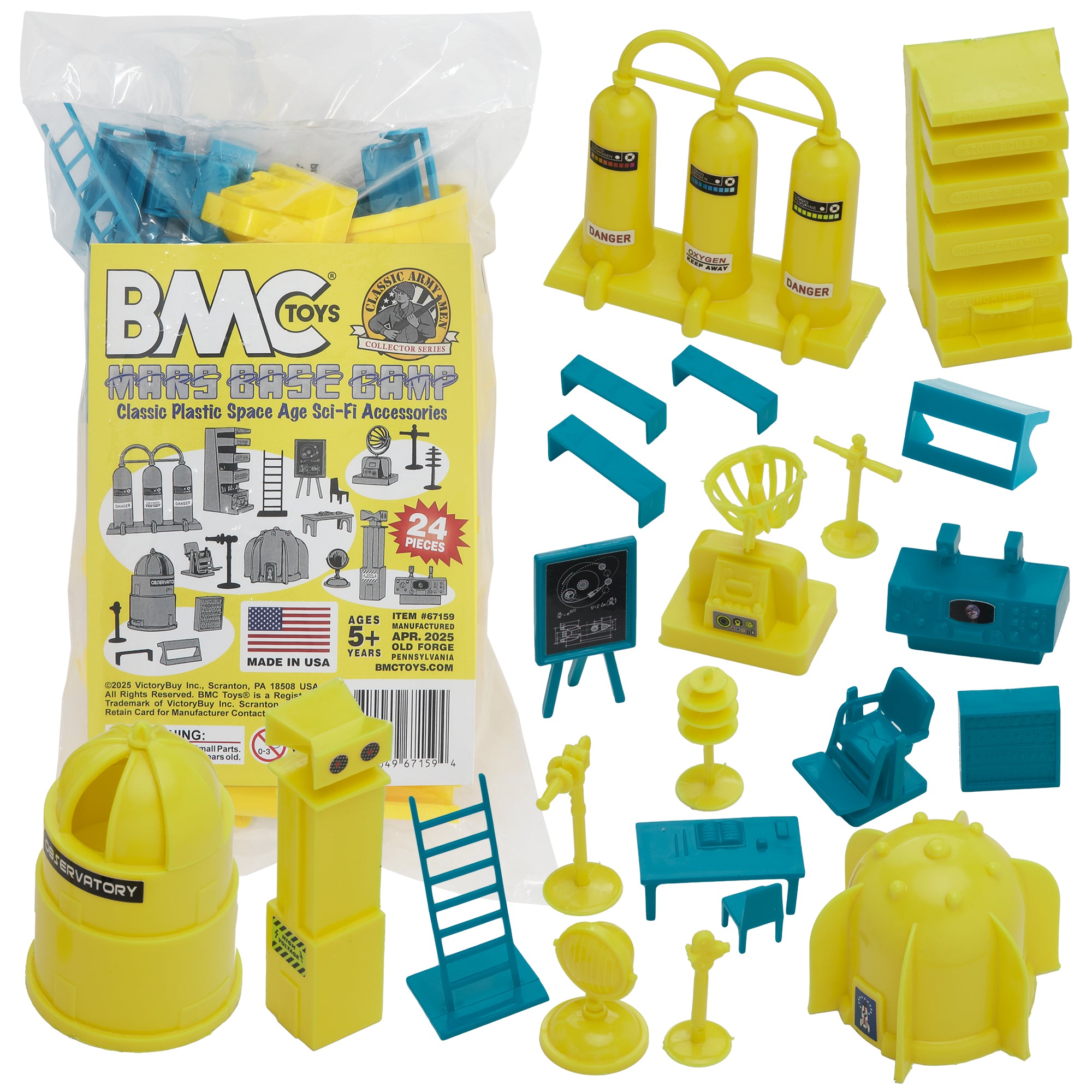 From the Classic Army Men Collector Series, BMC Toys brings back more classic toys from yesteryear. This 24 piece Set of includes a variety of space themed accessories and furniture. The following pieces are made from slightly stiff Yellow color HDPE plastic: Gravity Chamber, Observatory Dome with skylight, 3 chamber Fuel Tank, Radar Antenna, Supply Cabinet, Speaker Tower, Laser on Stand, Searchlight on base, Camera on stand, Telescope on stand, and Disc Antenna. These pieces are made from slightly stiff Teal-Blue color HDPE plastic: Teacher Desk, Chair, Easel, Ladder, 2 Student Desks, 4 Student Benches, Control Chair, and Control Console.