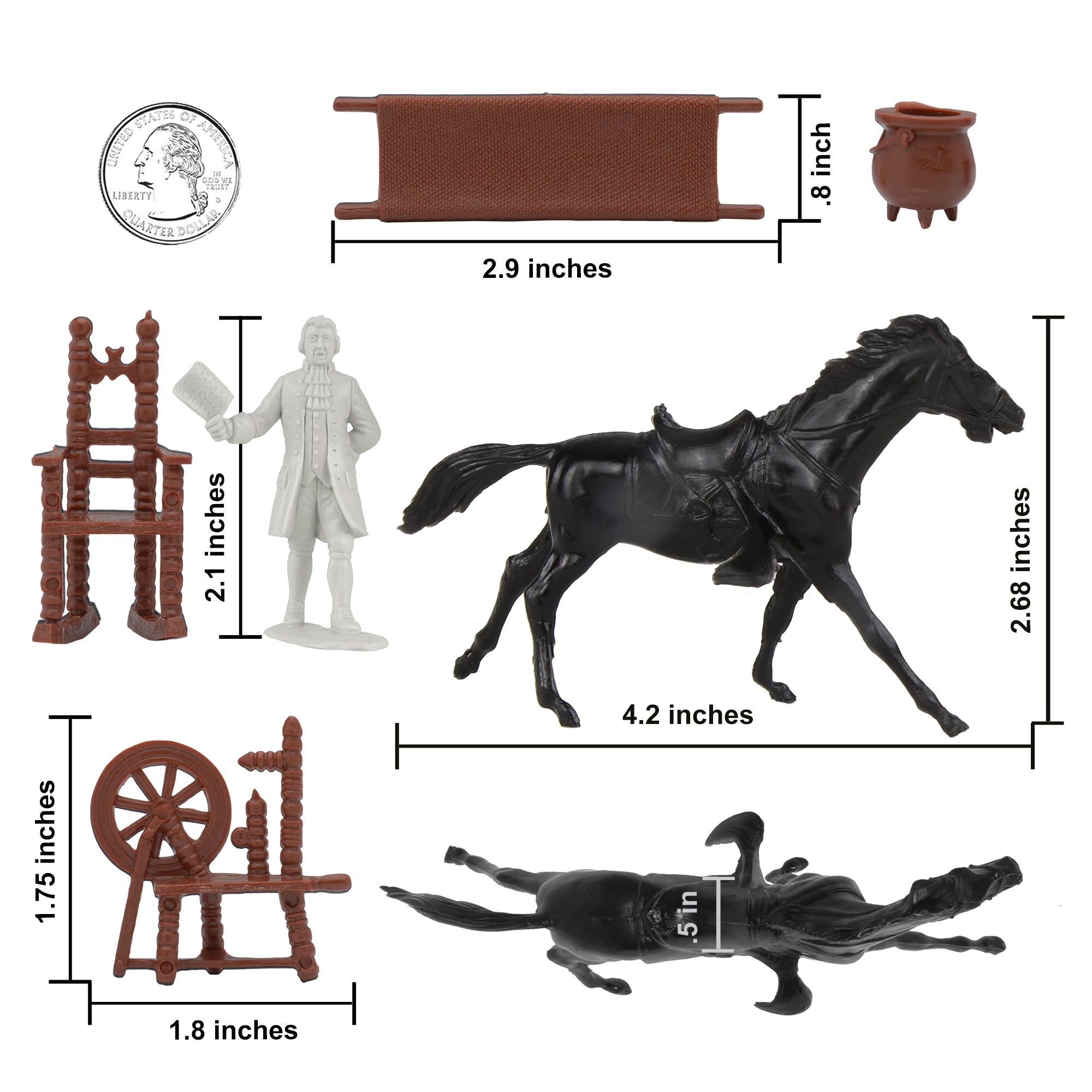 From the Classic Army Men Collector Series, BMC Toys brings the American Revolution to life. This 21 piece Set includes Paul Revere riding a horse, Samuel Adams, James Otis, 3 Colonial Civilians, 2 lanterns, and a variety of furniture and accessories. Figures stand up to 2.2 inches tall and are made from flexible LDPE Soft-White color plastic with very little flashing and lots of detail. The riding horse is made from Polypropylene Black color plastic with just a little flashing. Accessories are made from slightly stiff Rust-Brown color HDPE plastic. Pieces include chair. rocker, 3 stools, 2 benches, table, 2 lanterns, spinning wheel, musket stack, cast iron kettle, and horse hitching post.